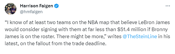 Stein还表示,如果湖人最终面临詹姆斯离队的情况,他们会加倍庆幸自己保留了唯一可以在赛季中交易的首轮选秀权,因为如果他们突然有詹姆斯的空缺需要填补,他们将在休赛期拥有灵活性,这个首轮签肯定会派上用场。