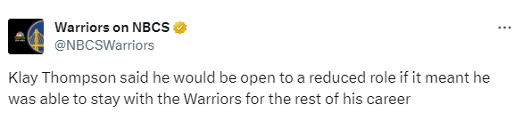 克莱表示自己愿意为了留在勇士队减少自己的角色戏份,克莱表示:那没什么问题,我明年就35岁了。在35岁时,经历过ACL和跟腱(断裂),仍然有能力成为一名非常出色的球员。也许不再是那个在三节打进60分,创造了NBA单节37分得分纪录的家伙,但仍然是球场上不可小觑的威胁。我把我的比赛方式塑造成了雷吉-米勒和雷-阿伦的风格,这些家伙直到生涯末期都非常高效。所以我打算按照那种模式继续前进。