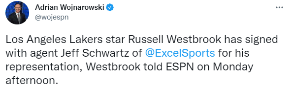 目前威少已经正式更换经纪人,据名记沃纳罗斯基报道,湖人后卫拉塞尔-威斯布鲁克已签约ExcelSports的杰夫-施瓦兹为其经纪人;杰夫-施瓦兹的NBA球员客户包括克里斯-米德尔顿、肯巴-沃克、CJ-麦科勒姆、凯文-乐福、尼古拉-约基奇、布兰登-英格拉姆和泰勒-希罗等人。