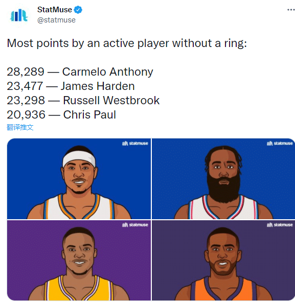 21-22赛季,安东尼为湖人队出战69场常规赛,场均贡献13.3分4.2篮板1助攻,投篮命中率44.1%,三分命中率37.5%,罚球命中率83%;据美媒Statmuse统计,当今联盟未夺冠的现役球员生涯得分排行榜前四依次是安东尼28289分、哈登23477分、威少23298分和保罗20936分。