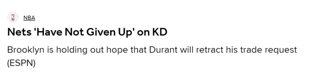 这很可能导致杜兰特在训练营开始前仍效力篮网,他要决定是撤销交易申请还是继续拖延,保持申请交易的立场。篮网一直不愿意真正送走杜兰特,他们当然希望看到的是前者。