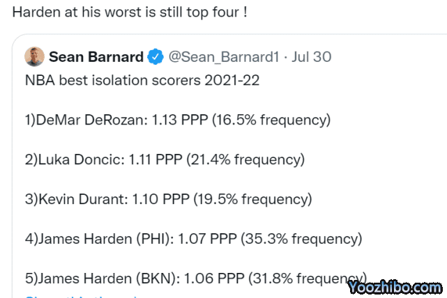 不少人批评哈登状态不好,但即便是这样一个状态不好的哈登,在上赛季的单打表现依然进入联盟前四。美媒晒出了2021-22赛季单打效率的排名,第一是德罗赞,每回合1.13分;第二是东契奇,每回合1.11分;第三是杜兰特,每回合1.10分,而第四是76人时期的哈登,每回合1.07分,第五是篮网时期的哈登,每回合1.06分。