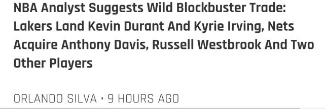 Ricky O'Donnell认为对于双方来说,这都是一个有趣的选择。“为什么湖人不为得到杜兰特提供戴维斯呢?湖人没有足够的选秀签来将篮网的两位巨星带进房间,但如果把戴维斯放上谈判桌,篮网一方肯定会竖起耳朵。”