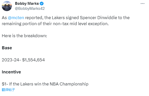 丁威迪与湖人的合同细节曝光,据NBA薪资专家Bobby Marks报道,丁威迪与湖人合同的基本薪金为1,554,654美元,此外,如丁威迪随湖人夺冠,他将得到1美元激励奖金。