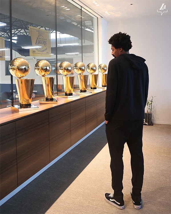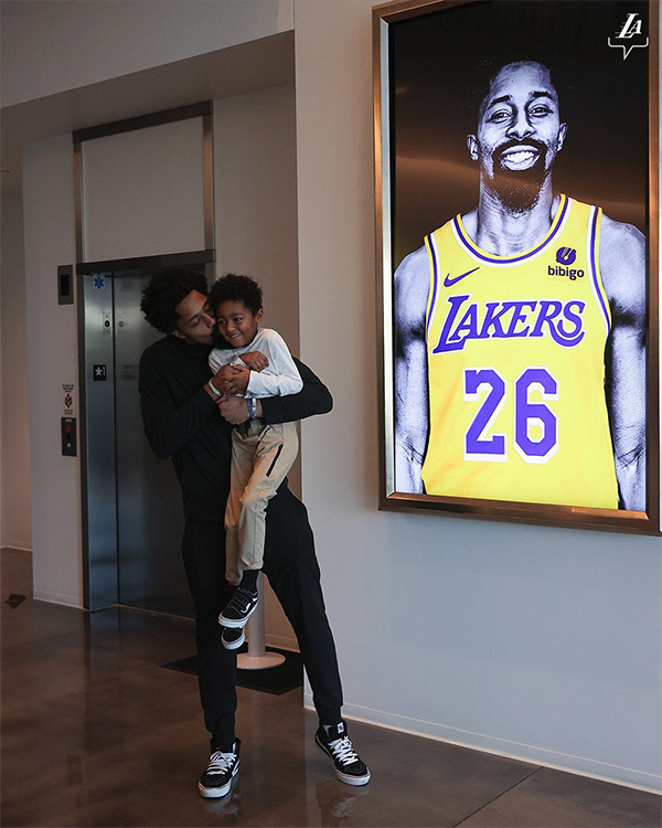 今日,丁威迪正式和湖人签约,他满脸笑容欣喜无比,之后丁威迪带着孩子参观湖人球馆,观看陈列在球馆中的一排总冠军奖杯;在更衣室中,丁威迪把球衣递给孩子,他的湖人26号球衣正挂在更衣柜中。