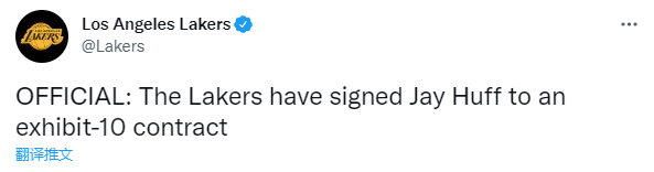 来源:24直播网07-28 10:1224直播网07月28日讯 ,湖人官宣再签一人,湖人官方宣布,球队正式与中锋杰伊-胡夫签下了一份Exhibit-10合同,这是一份一年无保障训练营合同,湖人训练营大名单增至19人,仅剩最后一个名额。