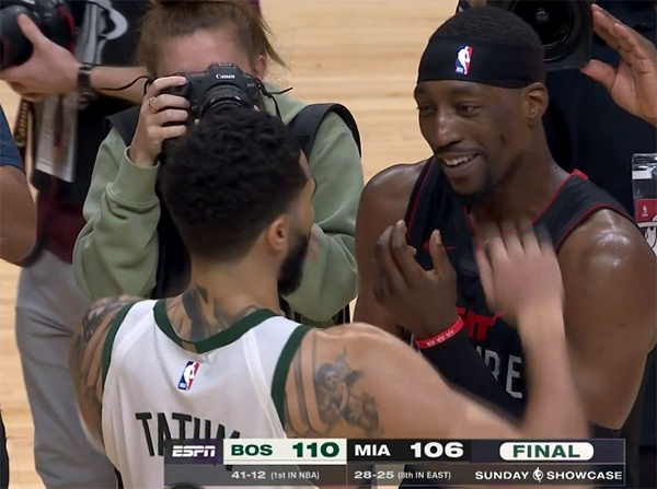 下半场,绿军第三节开场8-2把领先优势扩大到15分,随后马丁、希罗和阿德巴约带队13-2疯狂反扑,绿军连中三分立即稳住局面,热火继续反扑,三节打完热火落后7分;末节伤病满营的热火继续抵抗,希罗连中三分点燃主场,波神和塔图姆连续罚球锁定胜局,最终绿军客场再次击败热火;赛后塔图姆和阿德巴约开心热聊。