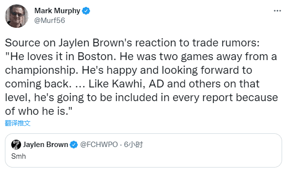 《波士顿先驱报》记者Mark Murphy转发了布朗的推文,同时写道:他(布朗)喜欢留在波士顿,他距离冠军只差两场比赛,所以他很高兴并期待着回到绿军阵中,就像小卡、浓眉和其他同级别的球员一样,他将因为他是谁而被每份报道所提及。