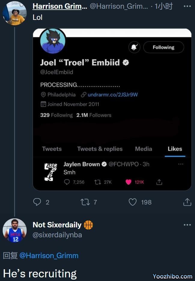 对此杰伦-布朗发推回应:搞不懂;布朗不解绿军交易自己的推文引热议,76人球星恩比德点赞吃瓜,有球迷表示:恩比德这是在招募。