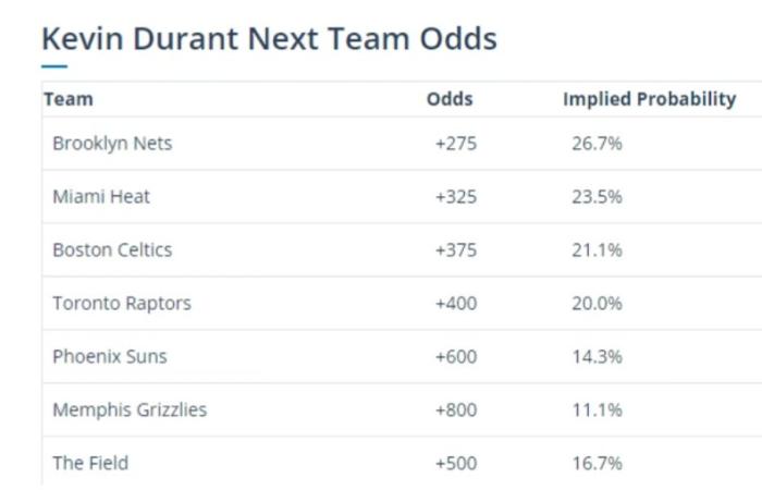 凯尔特人加入杜兰特争夺战,博彩网站更新了杜兰特的下家赔率,具体赔率情况是:篮网 +275(押100,若命中则连本带利返还375)、热火 +325 、绿军 +375、猛龙 +400、太阳 +600和灰熊 +800。