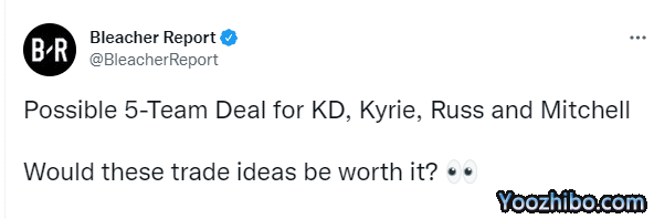 来源:24直播网07-24 11:1024直播网07月24日讯 ,美媒《露天看台》发推写道:涉及杜兰特、欧文、威少和米切尔的五队交易方案,这样的交易方案合理吗?欧文加盟湖人,杜兰特前往太阳,威少加盟爵士和米切尔加盟尼克斯,篮网获得多名年轻球员和5个首轮选秀权。
