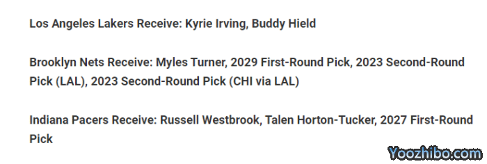 湖人得到欧文和希尔德;篮网得到迈尔斯-特纳、2029年首轮签、2023年次轮签(来自湖人的)和2023年次轮签(湖人来自公牛的);步行者得到威少、霍顿-塔克和2027年首轮签。