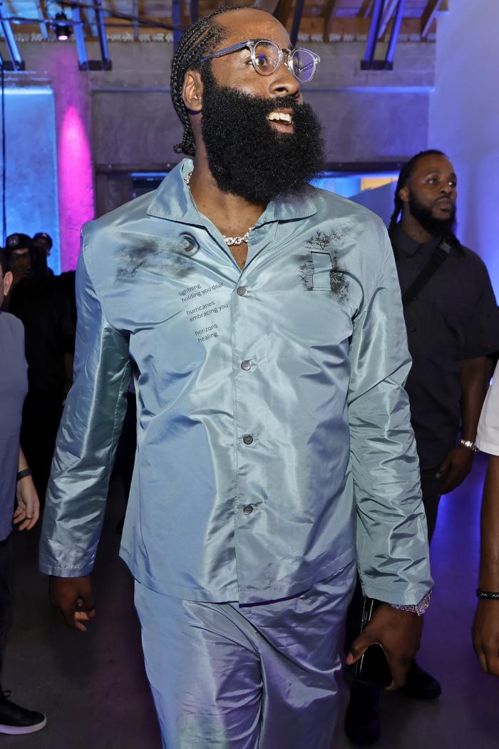 哈登的穿着打扮十分抢镜,穿着睡衣、梳着小脏辫、戴着颇具文艺范的眼镜参加派对,恩比德则是一身休闲装,双手抄兜显得有些酷。