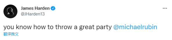 今夏哈登与恩比德的关系十分亲密,此前恩比德出席了哈登新品的发布会;不久前哈登晒出他与恩比德一起参加狂欢派对的合影,发推写道:你的派对真是太棒了。
