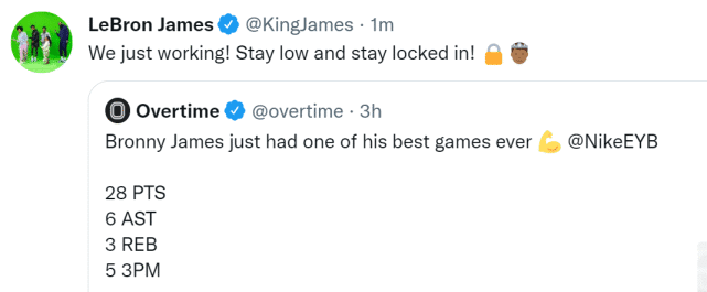 来源:24直播网07-19 10:0724直播网07月19日讯 ,美媒Overtime晒出了布朗尼在最近一场NikeEYB的比赛数据:28分6助攻3篮板5三分,并称赞:“布朗尼打出了他有史以来最好的一场比赛。”詹姆斯转发并写道:“我们只是在努力,保持低调,保持专注!”