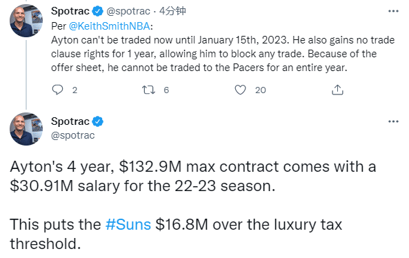 艾顿4年1.33亿美元的合同细节曝光,22-23赛季的年薪是3091万美元,直到2023年1月15日才可以被交易,艾顿还获得1年不可被交易的特权,由于合同限制,艾顿一整年都不能被交易到步行者。