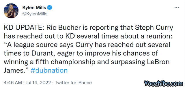 名记里克-布彻(姚明自传的作者)在节目上爆出了一则猛料。他表示,消息人士透露,库里已多次联系杜兰特讨论重聚。库里渴望通过与KD再次联手,来提高赢得第五个总冠军的概率,借此在冠军数量上超过詹姆斯。
