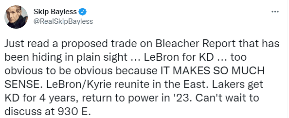 全美著名詹黑Skip力挺詹姆斯和杜兰特互换东家,试问一下,你觉得湖人真的会为杜兰特而交易詹姆斯吗?
