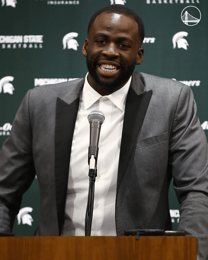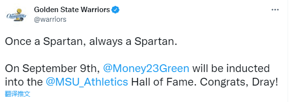 勇士官方晒出格林身穿正装的发言照并且祝贺格林,勇士官推写道:曾经是斯巴达人,永远都是斯巴达人,9月10日,格林将会正式入选大学名人堂,恭喜,德拉蒙德!