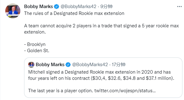 续签指定新秀顶薪的规则是一支球队不能有2名签下5年新秀顶薪合同的球员,篮网和勇士难以加入米切尔争夺战。