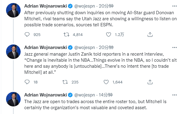 沃纳罗斯基报道,有很多球队打电话询价米切尔,爵士表示了拒绝,但对手球队表示爵士目前已经重新开始听取报价;目前爵士对于米切尔的要价非常高,戈贝尔交易后,爵士不再直接拒绝任何关于米切尔的交易来电。