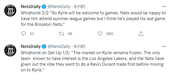 ESPN名记Windhorst在节目中表示:欧文交易情况目前仍没有进展。唯一对他感兴趣的球队是湖人,而篮网已经发出信号,他们想要先交易掉杜兰特再考虑欧文;所以欢迎欧文回来打比赛,篮网会很乐意让他参加夏季联赛,但我认为他已经打完了在篮网的最后一场比赛。