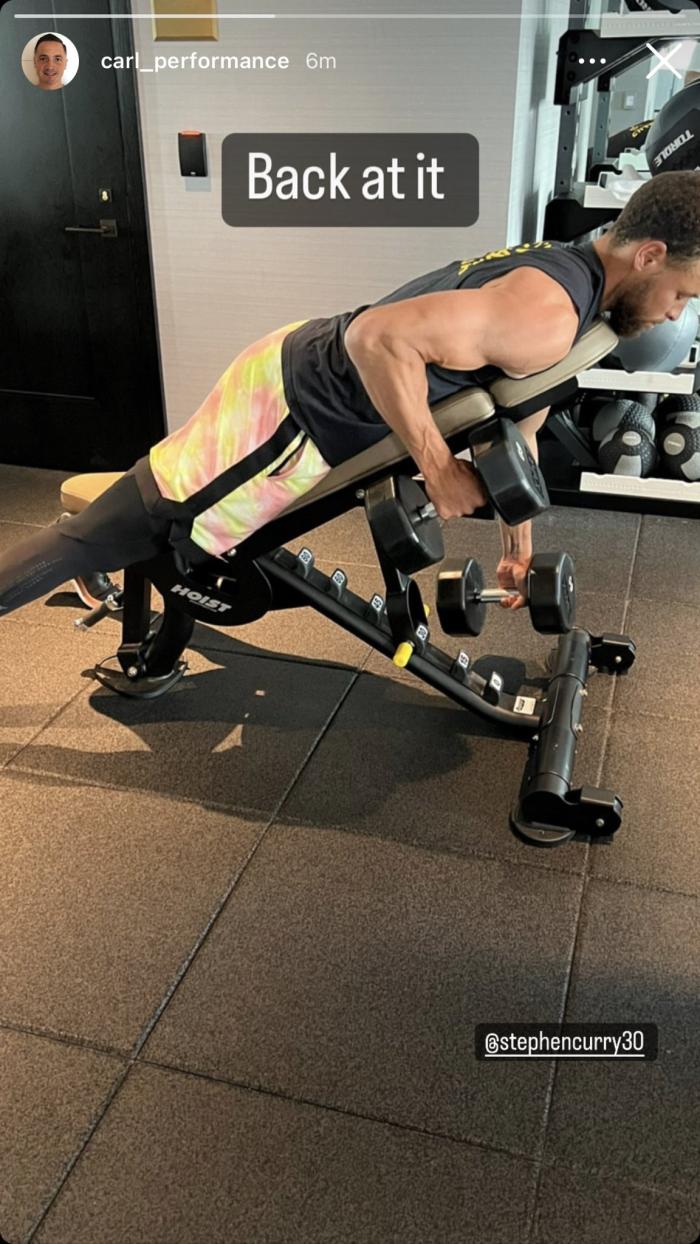 前几天,库里参加了塔霍湖的全美高尔夫名人赛,拿到41分并列第十六名,如今训练师晒出库里回归训练的画面,正在健身房进行力量训练,手臂粗壮太抢镜。