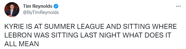 另外值得一提的是,NBA名记Tim Reynolds发推写道:欧文观看夏联所坐的位置是詹姆斯此前观看湖人比赛时的座位,换言之,詹姆斯和欧文隔天坐在同一个位置;Ralph Mason更是曝出猛料:听说欧文将会和詹姆斯一起观看湖人今天的比赛。