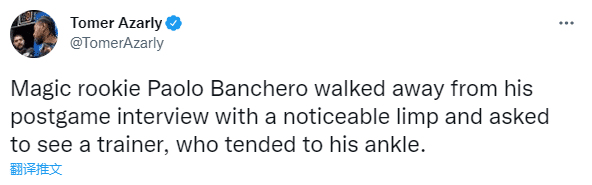 在魔术双加时绝杀国王赛后,状元班凯罗的脚踝出现不适的情况;据NBA记者Tomer Azarly报道,班凯罗赛后出现一瘸一拐的情况,他已经与训练师见面查看了他的脚踝情况。