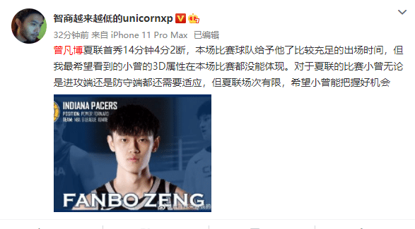 表现不佳!曾凡博夏联首秀冲上热搜,名记:3D属性没发挥出来