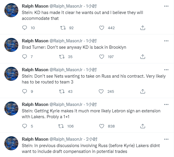 NBA两大名记都表示杜兰特明确表态想要离队,不想期待他重返篮网;Brad Tuener还表示湖人引援欧文有助于让詹姆斯提前续约,可能是1+1的合同。