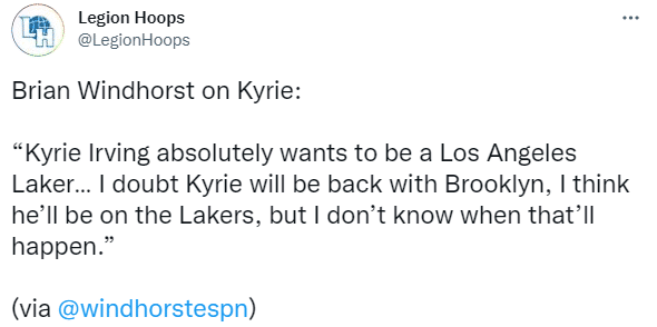 温霍斯特表示:欧文绝对想要加盟湖人,我不知道欧文是否愿意回归篮网,我认为他想加入湖人,但我不知道具体会在什么时候发生。
