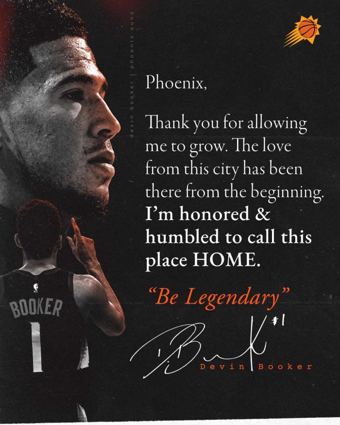 布克正式续约后发表声明:谢谢太阳队让我成长。来自这个城市的爱从一开始就存在。我很荣幸也很谦卑地称这里为家。