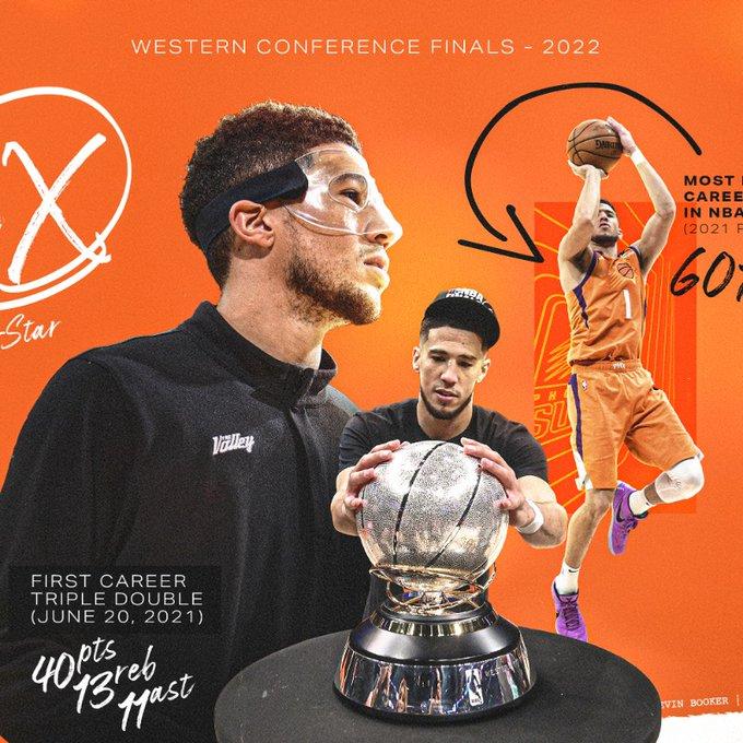 21-22赛季,布克为太阳出战68场常规赛,场均26.8分5篮板4.8助攻,64胜18负高居联盟第一,助太阳拿到队史最佳常规赛战绩;季后赛出战10场比赛,场均23.3分4.8篮板和4.4助攻,西部半决赛不敌独行侠被淘汰,抢七大战,布克的表现十分糟糕。
