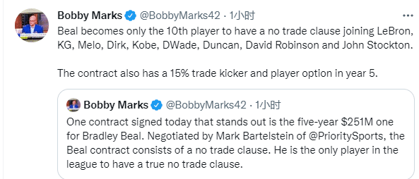 奇才官方正式宣布,球队与比尔签下了一份为期5年的提前续约合同,这是一份5年2.51亿美元的超级顶薪;5年合同细节曝光,据薪资专家Bobby Marks报道,比尔的合同中有15%的交易保证金,合同最后一年(第五年)含球员选项。此外,比尔的合同中还含有交易否决权。