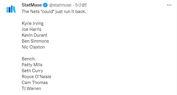 不久前,篮网连续签下TJ-沃伦与埃德蒙-萨姆纳两名球员,美媒Statmuse晒出了篮网目前的阵容名单——欧文、乔-哈里斯、杜兰特、本-西蒙斯、克拉克斯顿、米尔斯、赛斯-库里、罗伊斯-奥尼尔、卡梅隆-托马斯、TJ-沃伦和萨姆纳