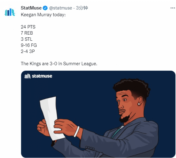 对于基根-穆雷的表现,NBA名记凯文-奥康纳发推直言:穆雷将在NBA至少打10年。