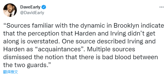 76人无意欧文,难道与哈登有关吗?据76人记者Dave Early透露,据布鲁克林消息人士透露,哈登与欧文之间关系不好的说法有些被外界夸大了,欧文和哈登是“熟人”,有多个消息源驳斥了这两位后卫不和的说法。