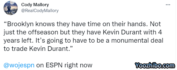 沃纳罗斯基在节目中表示:布鲁克林知道他们手头有时间,不仅仅是今年休赛期,而且杜兰特的合同还有4年,交易杜兰特将是一笔巨大的交易。