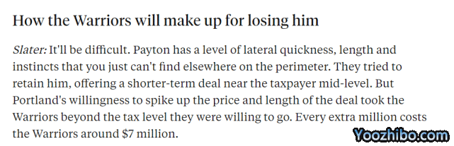 斯雷特表示这会非常困难。小佩顿的防守结合了速度、反应、臂展、本能等,是很难被取代的。勇士尝试留下他,比起开拓者的3年2800万,勇士提供的是一份接近中产的更短的合同,毕竟,勇士的薪金现状是每多花100万美元,他们实际支出是700万美元。