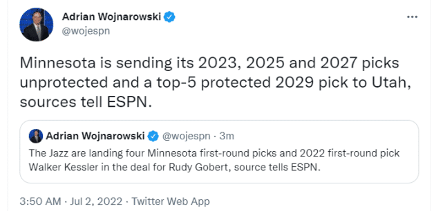 来源:24直播网07-02 12:0724直播网07月02日讯 ,据名记Woj报道,森林狼和爵士达成了一笔重磅10换1交易,森林狼将马利克-比斯利、贝弗利、凯斯勒、范德比尔特、博尔马罗和4个首轮签送往爵士,得到了三届最佳防守球员鲁迪-戈贝尔,具体的4个签是2023年、2025年和2027年的首轮,均为无保护,2029年是前五保护。后续报道称,森林狼还获得2026年首轮互换权。