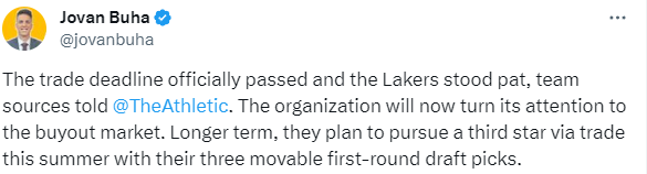 《洛杉矶时报》记者Brad Turner报道,湖人在截止日前按兵不动,是因为他们认为“我们喜欢现有阵容”,而且他们最有价值的资产也仅能换来微不足道的升级。他们希望能留下三个首轮,并在今夏交易得到一位关键球星。而且会积极地在买断市场中用中产合同寻求补强。”