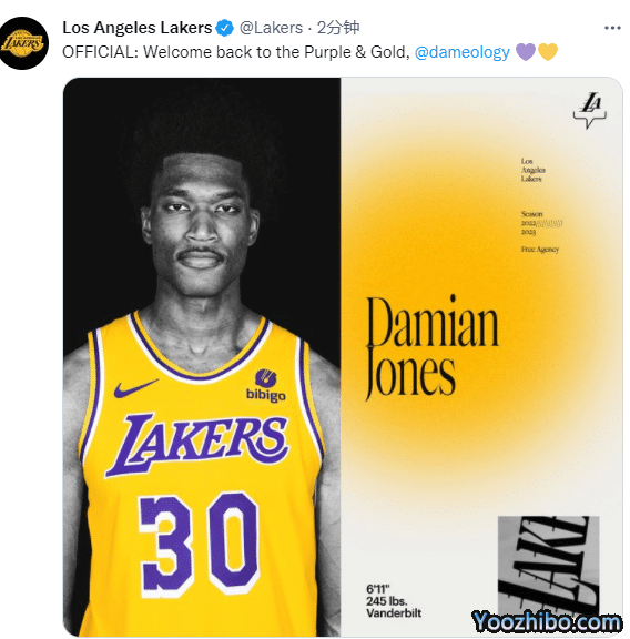 湖人宣布琼斯身穿30号球衣,欢迎他重返紫金军团;上赛季琼斯为湖人出战过8场比赛,场均5.4分3.3篮板,21-22赛季,琼斯场均8.1分4.4篮板1.2助攻;今夏湖人和琼斯签下2年合同。