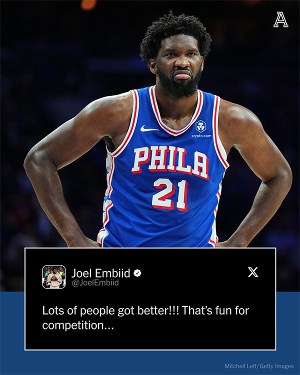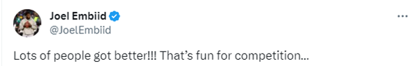 76人疯狂交易后,恩比德发推写道:很多人都变得更好了!!!这对于竞争来说很有趣。