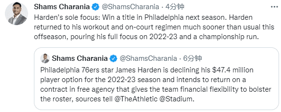 在今年东部半决赛G6被热火淘汰后,哈登曾表忠心并表示愿意做牺牲,当时他说:我会在这里;我会不惜一切代价让这支球队变得更好;如今哈登跳出合同为76人引援操作提供最大的财务灵活性,目前他唯一关心的就是新赛季帮助76人夺冠。