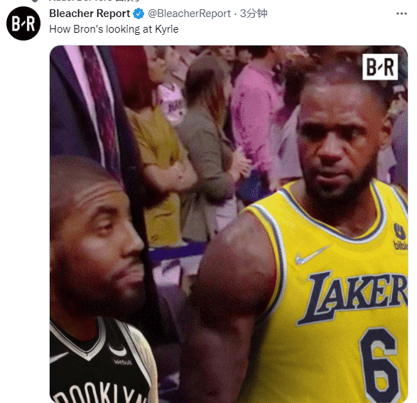 湖人曾以威少为主体交易筹码,向篮网报价欧文,结果惨遭拒绝;湖人有意欧文,无奈他们的筹码打不动篮网;很明显,欧文也不想放弃3000多万美元,最终他选择留在篮网,继续联手杜兰特;对此美媒《露天看台》晒图调侃詹姆斯怒视欧文。