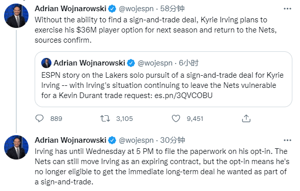 之后ESPN名记沃纳罗斯基跟进报道,消息人士证实,由于没找到可行的先签后换的交易方案,欧文执行球员选项;欧文需要在当地时间周三下午5点之前向联盟提交执行合同的正式文件;虽然篮网不能用先签后换的方式交易欧文,但他们仍能交易欧文的到期合同。
