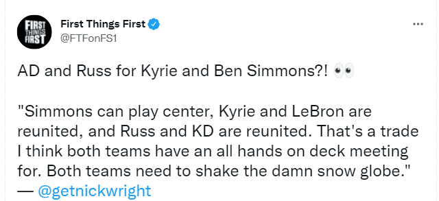 美媒Fadeaway World认为这笔方案确实很有趣,因为欧文想在洛杉矶和詹姆斯重聚,而威少也可以和前队友杜兰特在布鲁克林重逢。当然,这只是赖特的个人建议,此前有报道称湖人没有兴趣交易浓眉,预计欧文+西蒙斯这样的问题球员组合报价,也很难打动佩林卡和珍妮-巴斯。