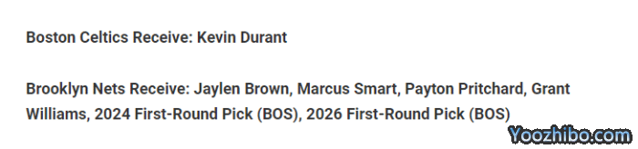 篮网送走杜兰特,从凯尔特人得到杰伦-布朗、斯玛特、普理查德、格兰特-威廉姆斯、2024年首轮选秀权和2026年首轮选秀权。