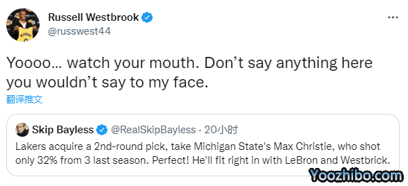 此前湖人用第35号签选中马克斯-克里斯蒂,斯基普-贝勒斯不仅嘲讽威少是铁威,还嘲讽湖人新秀的命中率,当时贝勒斯发推写道:湖人队获得了一个二轮选秀权,选择了来自密歇根州立大学的马克斯-克里斯蒂,他上个赛季的三分命中率只有32%。完美!他会完美契合勒布朗和威斯布鲁铁(Westbrick)。